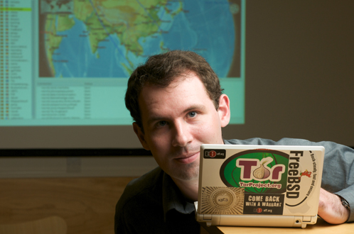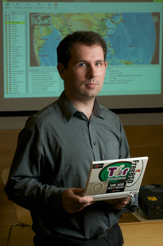 Part of the “Vanguard of Computation series”, by portrait photographer Roland Eva, taken in April 2009, Cambridge, UK. The image in the background is the Vidalia network map, showing paths chosen through the Tor anonymous communication network.