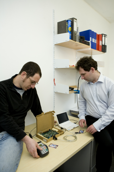 From an article in the May 2010 edition of Sciences et Avenir: “Les cartes trahies par leur puce”, on the no-PIN attack. Photos taken in March 2010, Cambridge, UK, by Elisabeth Blanchet. Also in the photos is Saar Drimer.